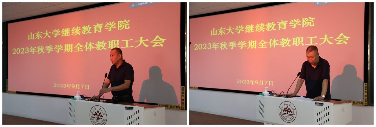 院长陈志军首先传达了学校2023年秋季学期工作会议精神,并对学院秋季学期重点工作进行部署。他指出,学院秋季学期的工作思路是,落实教育部关于继续教育办学要求,贯彻学校秋季学期工作部署,以“全面图强”作为新的奋进坐标,持之以恒深化思想解放、持之以恒加快改革突破、持之以恒落实发展要务、持之以恒提升治理水平,准确把握国家重大发展战略和山东省经济社会发展需求,坚持面向行业、企业、政府、职业院校,服务学校“双一流”建设,助力学科发展,强力推动继续教育高质量发展实现新突破。学院秋季学期重点任务涵盖“持续彰显党的领导优势”“持续推进学历继续教育高质量发展”“持续推进非学历继续教育规范发展”“持续推动高等教育自学考试提质增效”和“持续提升学院综合服务保障能力”等五个方面。
