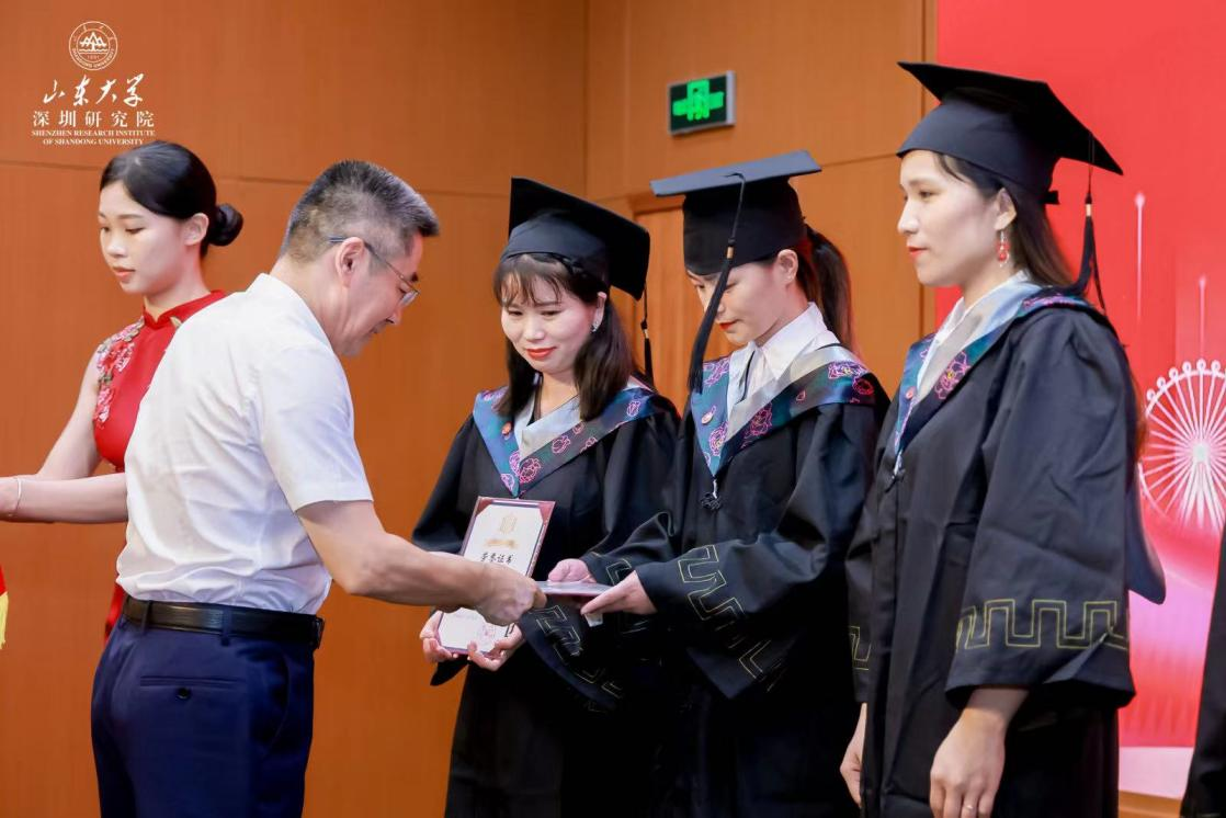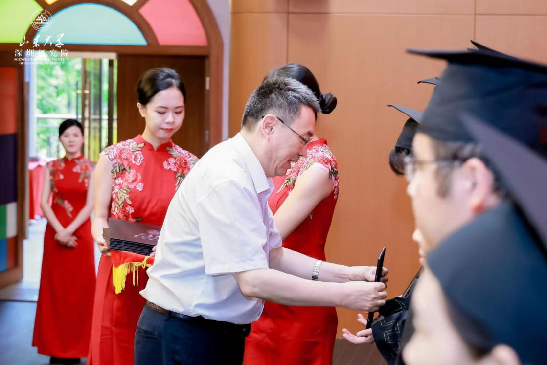 典礼上,吴臻为获得beat365英国官方网站学士学位的毕业生代表拨正流苏、颁发学位证书并合影留念。同学们弯身鞠躬,用双手接过证书,将微笑定格在此刻美好的山大记忆,整个仪式沉浸在幸福喜悦的氛围之中。
