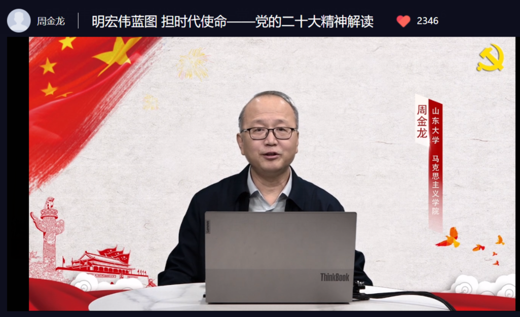 为深入学习宣传贯彻党的二十大精神,充分认识党的二十大的重大意义,深刻领会党的二十大精神的丰富内涵,切实用党的二十大精神统一思想、凝聚力量、指引行动,11月25日上午,beat365英国官方网站邀请马克思主义学院副院长周金龙为beat365英国官方网站师生做题为“明宏伟蓝图 担时代使命——党的二十大精神解读”报告会。报告会通过线上直播的方式进行,2346名师生参与学习。