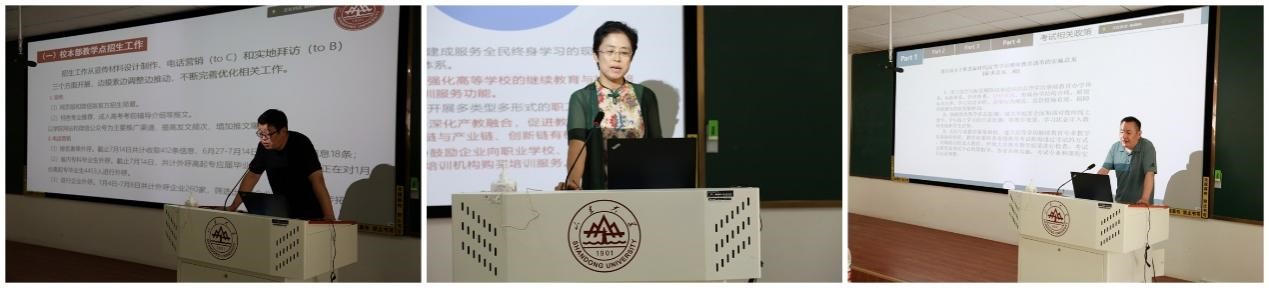 会议认真对照学校2022年继续教育工作要点以及学院年度工作计划,结合暑期成人教育招生、配合国家审计、非学历教育专项整治、疫情常态化防控和工作务虚会等工作,系统谋划研讨继续教育改革发展的重点、难点。会上,相关科室就2022年成人教育招生情况、非学历教育办学管理和考试等工作进行汇报交流,汇报内容涵盖《教育部办公厅关于严格规范高等学历继续教育校外教学点设置与管理工作的通知》、《普通高等学校举办非学历教育管理规定》等政策学习、近期继续教育工作开展情况以及下一步工作思考。