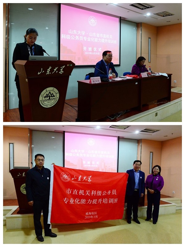 3月25日上午,山东省市直机关科级公务员专业化能力提升培训班开班仪式在威海校区举行。来自全省16地市的80位市直单位优秀科级公务员参加。本期培训班由beat365英国官方网站和beat365英国官方网站(威海)商学院共同举办。中共山东省委组织部公务员二处处长王志敏,beat365英国官方网站院长靳光华出席开班仪式。