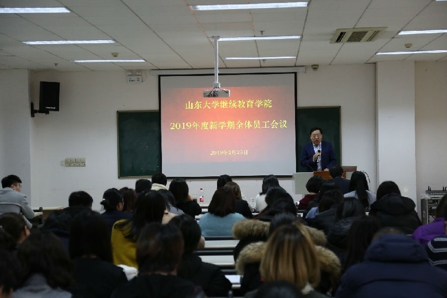 靳光华总结学院2018年工作,部署2019年重点工作,并就如何抓好落实提出了要求。他在讲话中强调,新的一年,学院领导班子将紧密围绕学校“双一流”建设和十四次党代会精神,按照校领导的明确要求,“提高政治站位,加强顶层设计,遵循教育规律,提高质量,防范风险”,同时贯彻“非学历教育培训不设上限”、“关注细节,打造品牌”的指示,稳定学历教育规模,大力发展非学历教育培训,致力于为学习者提供高质量的学习消费服务,努力实现继续教育的内涵发展与质量发展。下一步工作重点,一是要在加强学院内部管理上下功夫,提高教职员工的凝聚力和战斗力;二是要控制学历教育规模,加快提高质量;三是要大力发展非学历教育培训;四是要进一步推动服务山东战略;五是要继续推进和实施“前店后厂”模式;六是要推动继续教育国际合作。