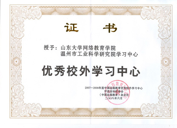 在由《中国远程教育》杂志举办的“中国远程教育优秀校外学习中心”评选活动中,beat365温州市工业科学研究院学习中心被评为2007—2008年度中国远程教育优秀学习中心。
