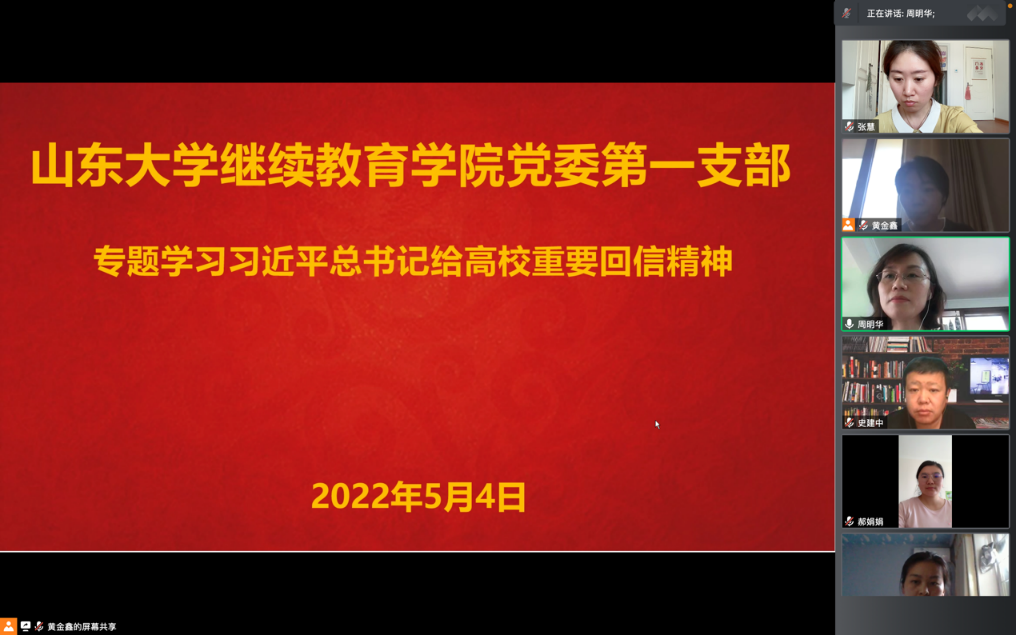 会上,第一、第二支部全体党员分别领学《习近平总书记给在首钢医院实习的西藏大学医学院学生的回信》、《习近平总书记给北京大学援鄂医疗队全体“90后”党员的回信》、《习近平总书记给北京科技大学全体巴基斯坦留学生的回信》等重要回信精神,并围绕学习内容,立足岗位实际,聚焦疫情防控和继续教育改革高质量发展,进行交流研讨。大家一致认为,当前疫情防控形势依旧严峻,必须坚决贯彻落实学校和学院的各项决策部署,牢记总书记的嘱托,坚守教育初心、践行使命,争做表率、敢为先锋,发扬五四精神并在实践中彰显青年的时代责任与担当。