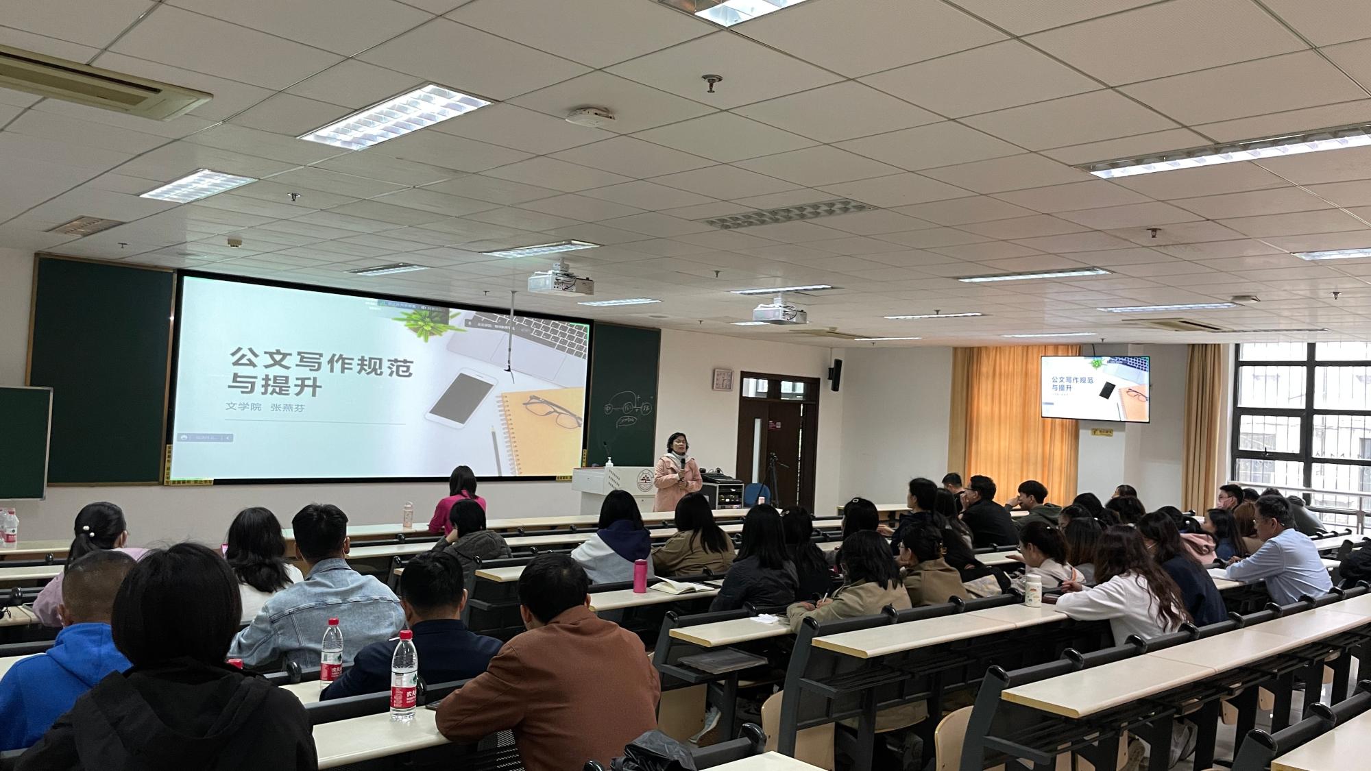 研修班特别邀请beat365英国官方网站文学院张燕芬副教授作专题讲座。张燕芬教授以《公文写作规范与提升》为题,从公文的种类、概念、格式、办文规定及流程(行文规则)等方面,重点讲述了常见公文写作基本知识,用理论和实际案例对计划、总结、典型材料等应用频率比较高的事务公文写作技法和标点符号及数字的用法进行了深入浅出、全面系统的讲解,授课既突出了理论指导,又坚持了实践提升,具有很强的针对性和实用性。